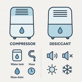 - ① 유형: 콤프레서=여름 강력·가성비 / 데시칸트=저온 강점 / 하이브리드=사계절